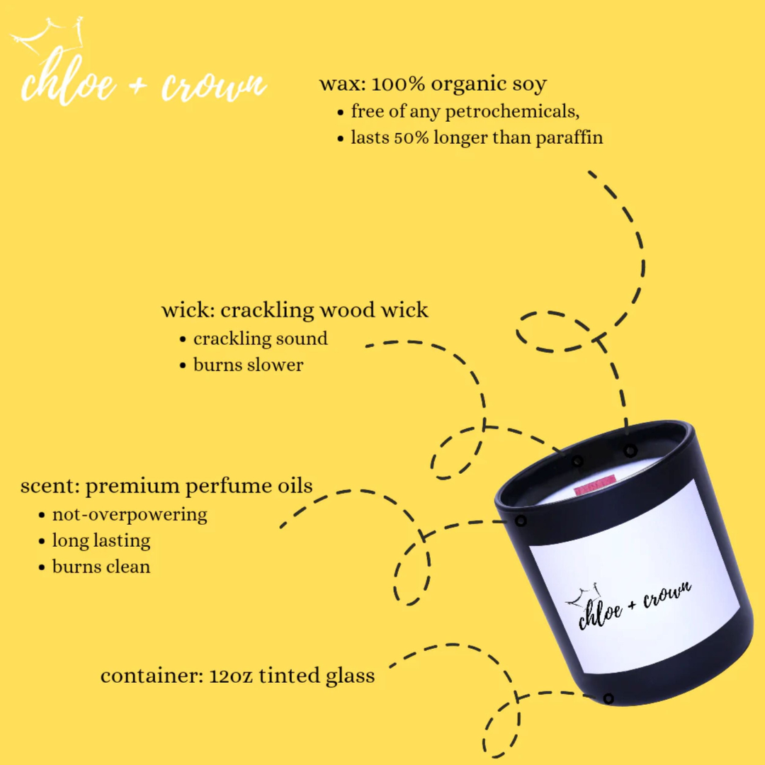 | Clean Burn, Clean Conscience | *Chloe & Crown Candles are committed to a clean burn, leaving no residue or soot behind. Revel in the ambiance without compromising air quality or the environment. |
